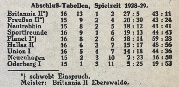 In der Saison (1928/29) wechselte man in den Bezirk Finowtal. Diese Spiele/Ergebnisse konnten bisher recherchiert werden.