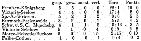 Victoria Seelow (Meister der Vorsaison) Preußen Königsberg Union Freienwalde (später Kurmark Freienwalde) Sportverein Wriezen Schwimm- und Sportclub Müncheberg Marco Helvetia Buckow Victoria Selchow (zog im Saisonverlauf zurück) FV Falke Cöthen (kam im Saisonverlauf hinzu)
