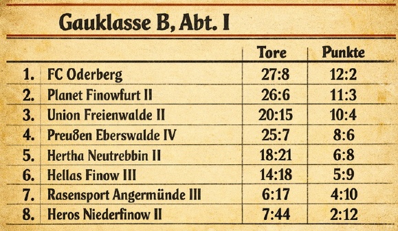 31.08.1930: FC Oderberg (II) - Heros Niederfinow II 4:0 21.09.1930: Rasensport Angermünde III - FC Oderberg (II) 0:1 19.10.1930: Planet Finowfurt II - FC Oderberg 5:2 02.11.1930: FC Oderberg - Preußen Eberswalde IV 3:2 16.11.1930: FC Oderberg - Hertha Neutrebbin II 5:1 07.12.1930: FC Oderberg - Union Freienwalde II 5:1 14.12.1930: Hellas Finow III - FC Oderberg 1:7